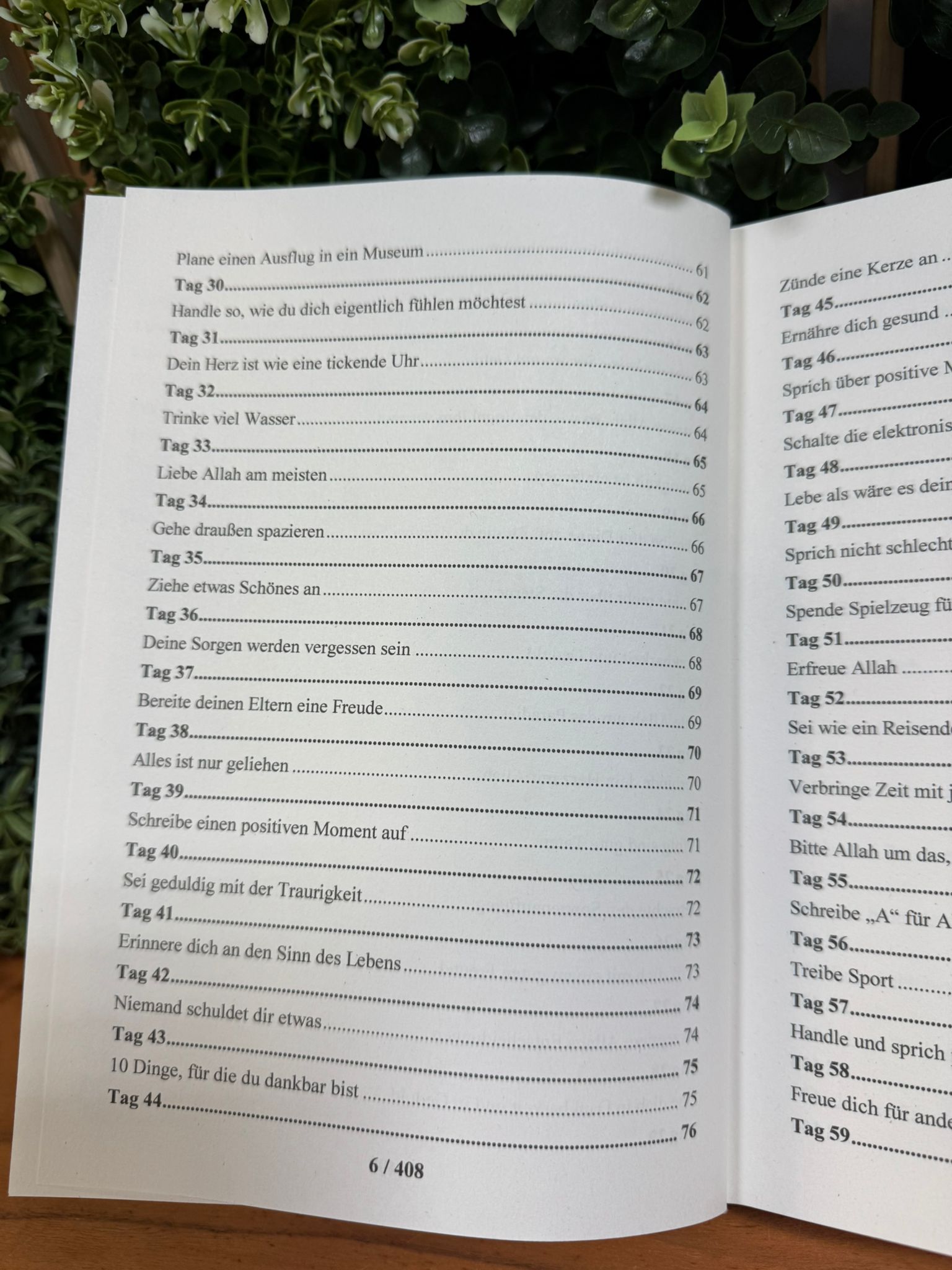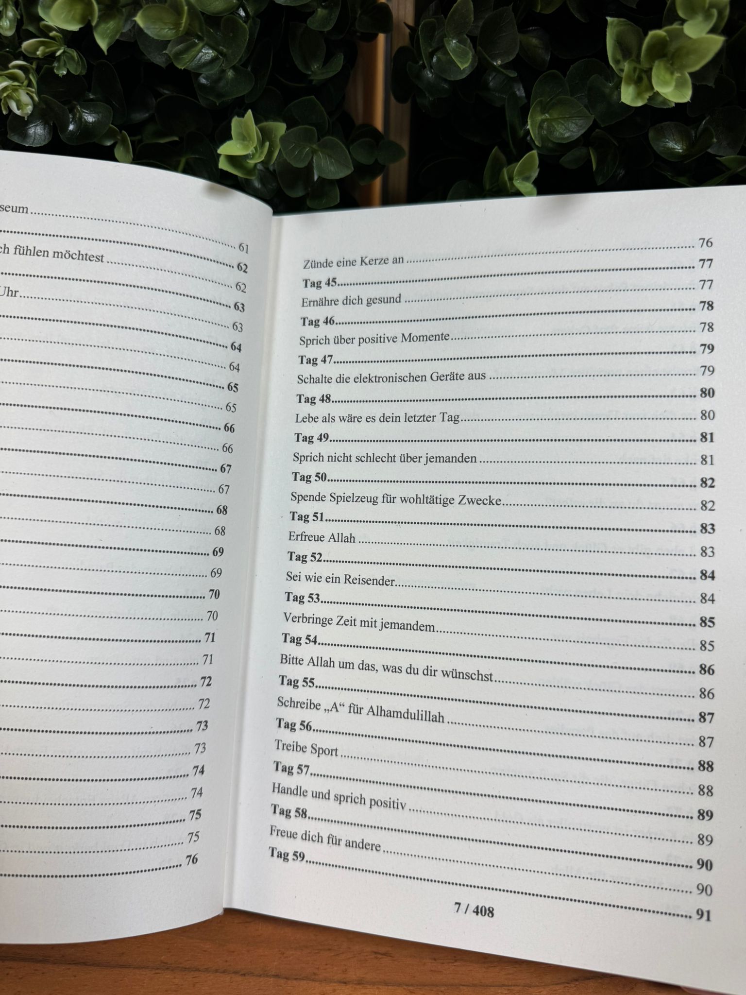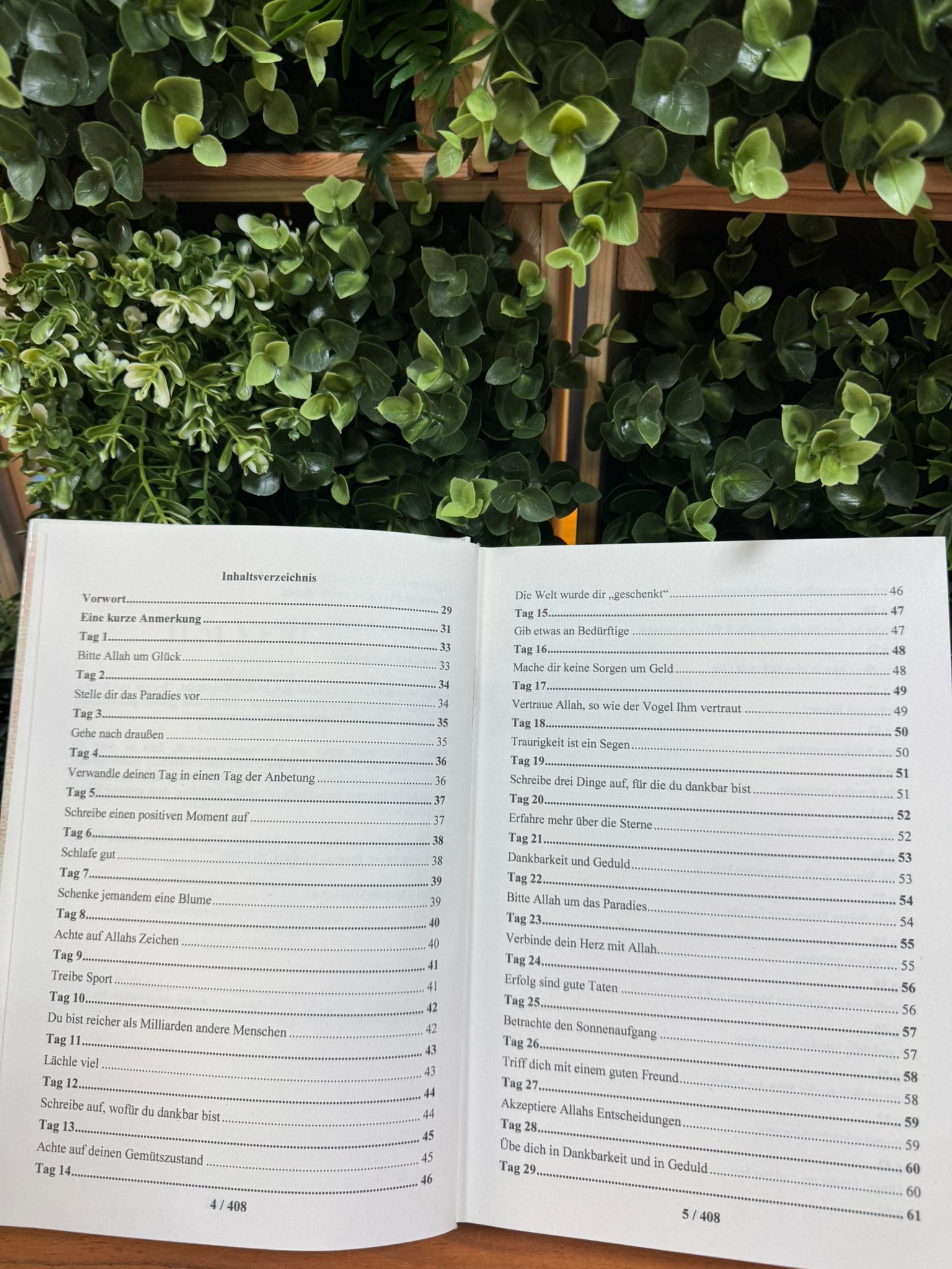 Auf jeder Seite findest du einen Vers aus dem Heiligen Qur’an oder eine wertvolle Weisheit unseres geliebten Propheten Muhammad (saw.), die dir zeigen, wie du ein glücklicher, zufriedener und guter Mensch wirst.